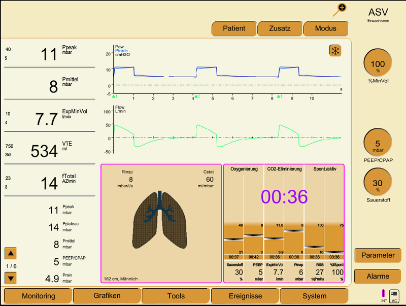 Smart Care: Spontanatmung im ASB-Modus Unterstützungsdruck nach Frequenz, Tidalvolumen und etCO2