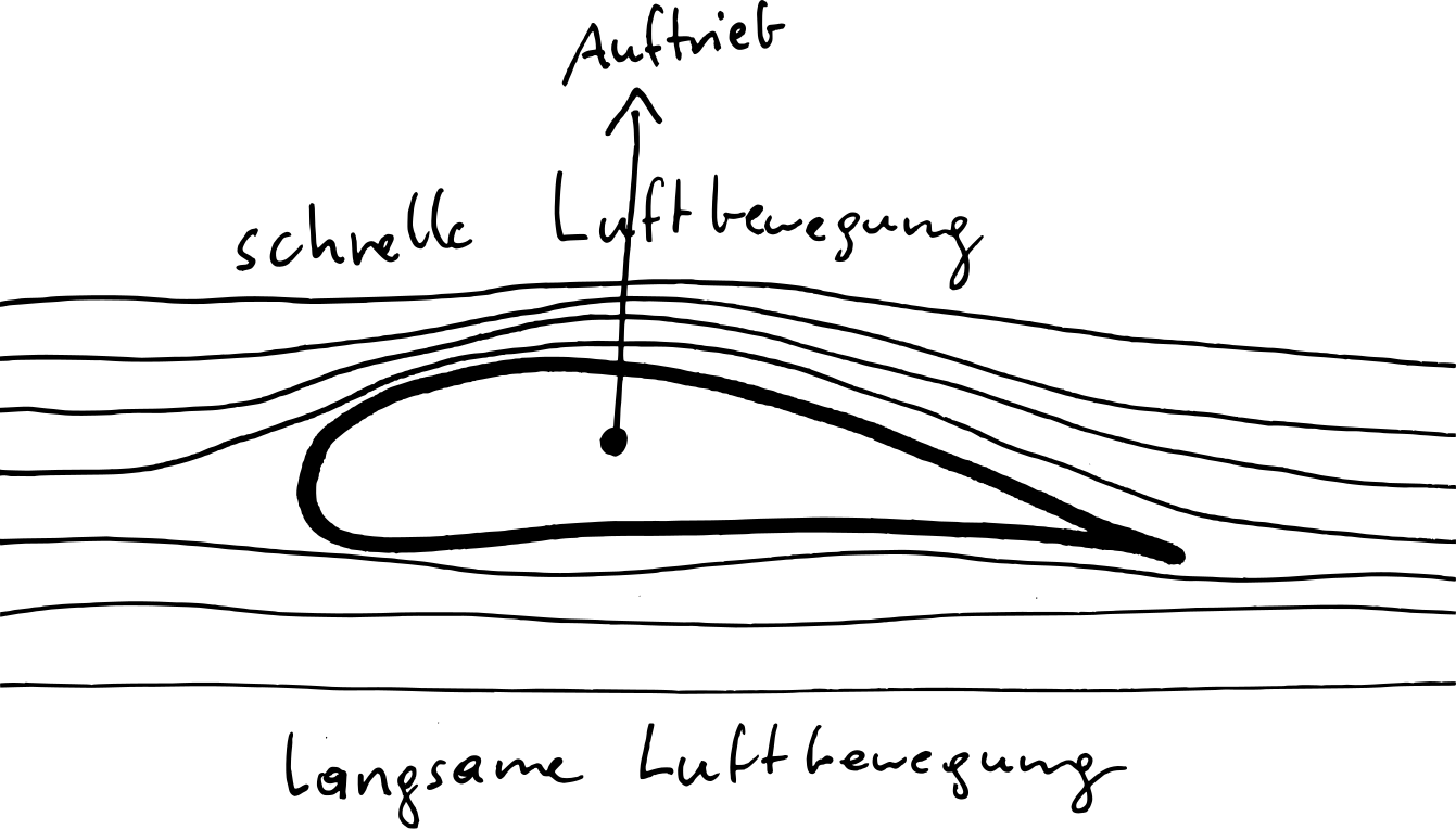 Tragflächenprofil: Luft strömt oben schneller → Druck sinkt → Auftrieb entsteht.