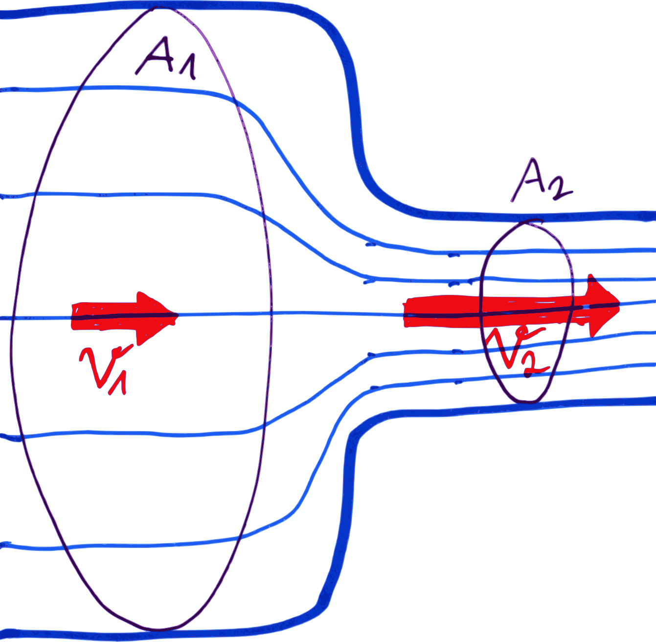Verengt sich der Querschnitt (\(A\) kleiner), muss die Geschwindigkeit (\(v\)) steigen.