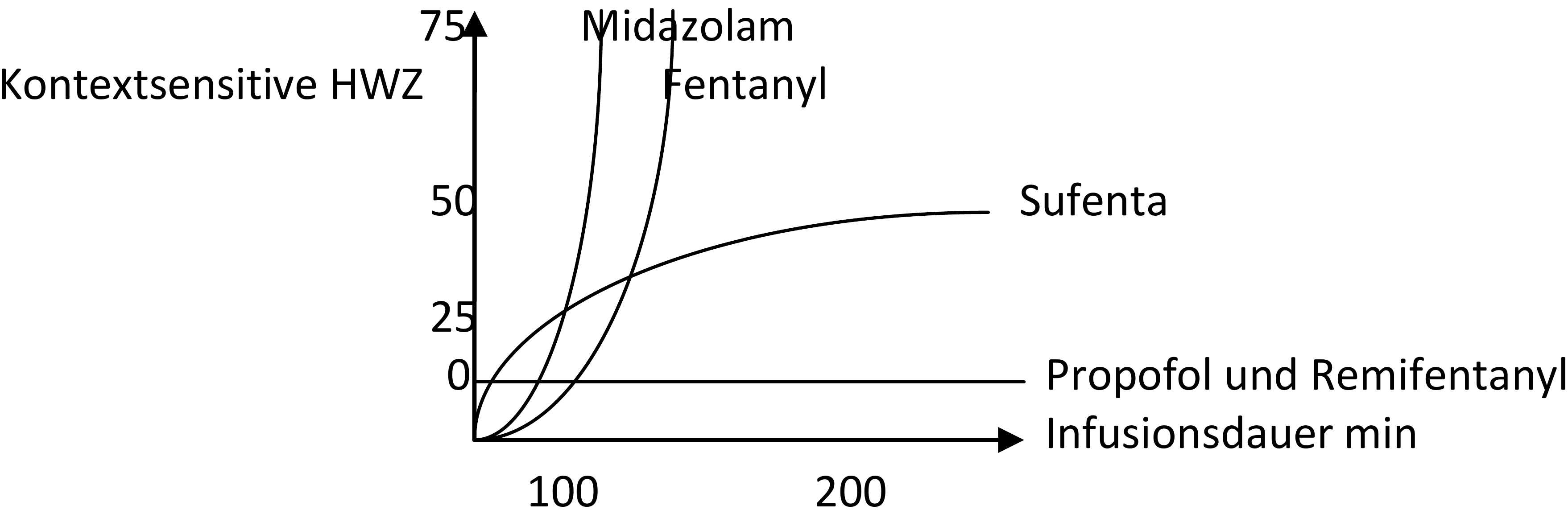 Lange Aufwachzeiten nach langer TIVA ergeben sich aus der verlängerten 80% Konzentrationsabfallskurve von Propofol, die deutlich länger braucht als Remifentanil. Daher Propofol beim Zunähen stoppen, und Remifentanil höher drehen!